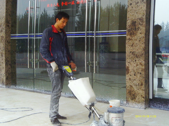 最早以及很長的一段時期,人們發明采用一種固體膏狀蠟進行表面的涂層作保護和增加亮度,如地板就是利用這種固體蠟配合打磨機,把蠟涂在地板,平衡分布并磨亮,但由于這種蠟呈油性,自然空間的塵埃很自然吸附著蠟表面,造成污染的產生。無硬度,人們腳步帶進的塵土,固體蠟的硬度不能承受磨擦很容易將石材磨花,遇到水更容易變滑,危及行人,不管怎樣這是第一代石材護理方法,在當時是唯一的選擇,并且維持了很長一段時間。