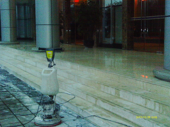 再到80年代末,緣自歐洲程序的一種工藝,“晶面處理系統”于90年代推進中國市場。這個系統就是針對水蠟工藝上硬度、光澤、清澈度不夠及工藝復雜等不足改良而成的,其工藝原理就是在石材投入使用及未受磨損前,以幾種水晶加強劑配合機械,利用石塊籍壓于熱力產生之化學作用,先將石材表層下的氣孔封閉,使其污垢不能滲入,同時表層上加上幾層熱處理保護層,起到增加石材表面的硬度和光度,更有防滑之功效,石質原有天然色澤得到帶出及全面性保護,保持度教一般水蠟高幾倍。長期使用,耗用的人力物料成本較水蠟低,無須每天補蠟及定期起蠟等復雜工序,此工藝為目前大理石保養及翻新后晶面的理想工藝,我們稱為石材打蠟第三代。